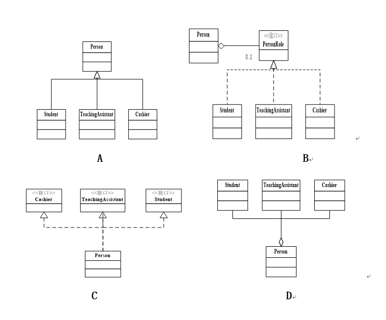 23、“一个研究生在软件学院做助教(teaching assistant),同时还在校园餐厅打工做收银员(cashier)。也就是说,这个研究生有3种角色:学生、助教、收银员,但在同一时刻只能有一种角色。”
